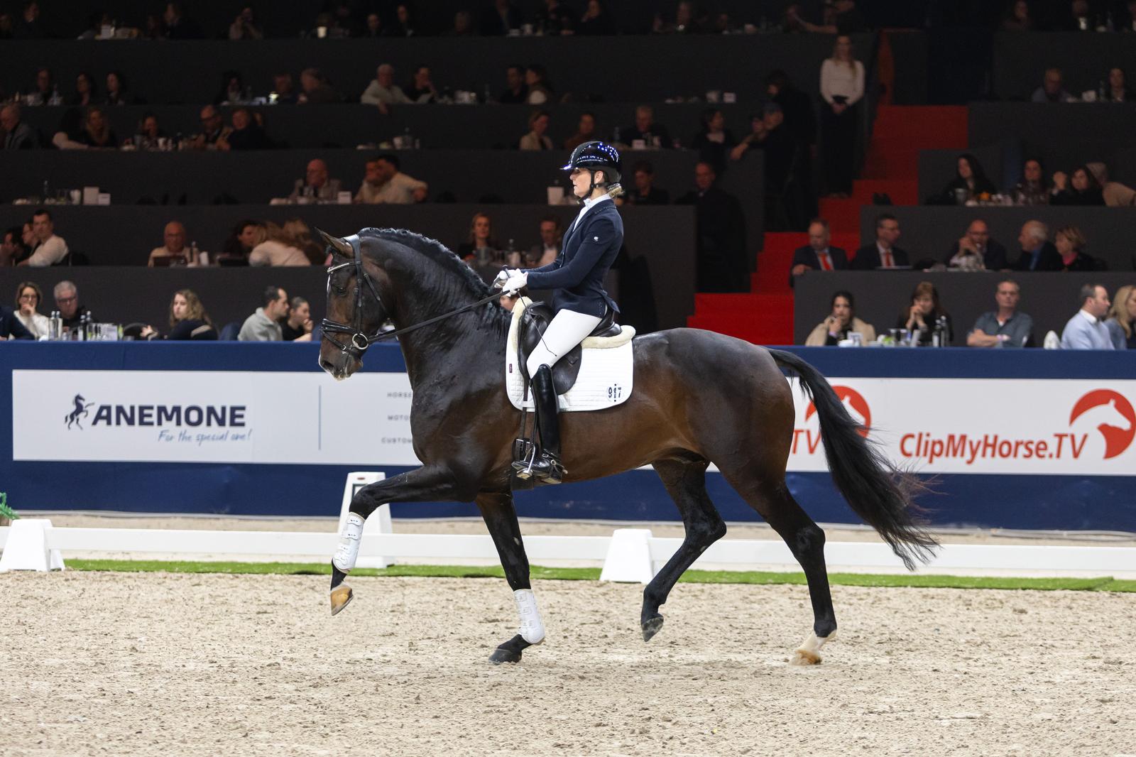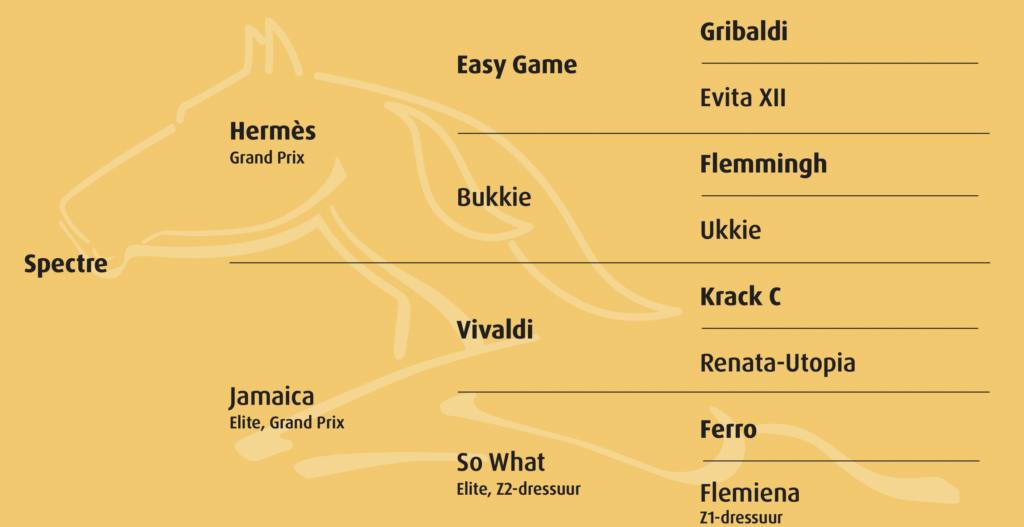 half-sister of the Grand Prix dressage horse Koku (by Farmer).Spectre’s father, Hermès, shone with Dinja van Liere in the saddle at the highest level. They were for years the best combination for the Netherlands, achieving fourth place at the Olympic Games in Paris and three bronze medals at the World Championships in Herning. The pedigree of Spectre creates high expectations for a career in top-level sport and a successful future as a breeding stallion.