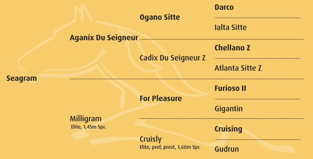 Seagram is een zoon van Aganix du Seigneur, die met Jos Lansink tot het hoogste niveau uitkwam in de sport tot de kleinzoon van Darco geblesseerd raakte en volledig voor de fokkerij werd ingezet. Daarin hoort Aganix du Seigneur binnen korte tijd tot het rijtje topverervers met veel nakomelingen op het hoogste niveau.